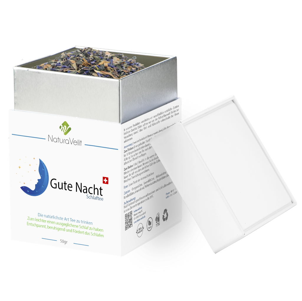 Um nachts rascher zur Ruhe zu kommen, hat NaturaVelit den Gute Nacht Schlaftee entwickelt. Gute Nacht Schlaftee hilft Ihnen leichter in den Schlaf zu finden und durchzuschlafen. Gute Nacht Schlaftee besteht zu 100 % aus natürlichen Inhaltsstoffen.
